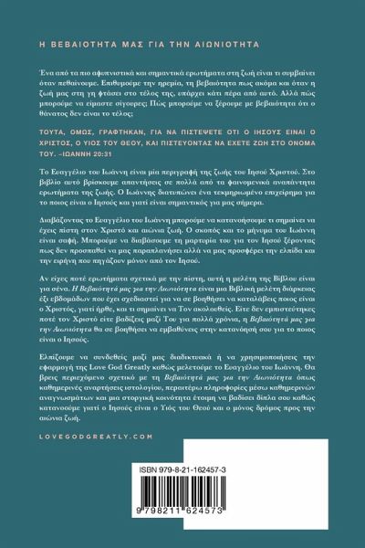 Ένα από τα πιο αφυπνιστικά και σημαντικά ερωτήματα στη ζωή είναι τι συμβαίνει όταν πεθαίνουμε. Επιθυμούμε την ηρεμία, τη βεβαιότητα πως ακόμα και όταν η ζωή μας στη γη φτάσει στο τέλος της, υπάρχει κάτι πέρα από αυτό. Αλλά πώς μπορούμε να είμαστε σίγουρες; Πώς μπορούμε να ξέρουμε με βεβαιότητα ότι ο θάνατος δεν είναι το τέλος; Τούτα, όμως, γράφτηκαν, για να πιστέψετε ότι ο Ιησούς είναι ο Χριστός, ο Υιός τού Θεού, και πιστεύοντας να έχετε ζωή στο όνομά του. -Ιωάννη 20:31 Το Ευαγγέλιο του Ιωάννη είναι μία περιγραφή της ζωής του Ιησού Χριστού. Στο βιβλίο αυτό βρίσκουμε απαντήσεις σε πολλά από τα φαινομενικά αναπάντητα ερωτήματα της ζωής. Ο Ιωάννης διατυπώνει ένα τεκμηριωμένο επιχείρημα για το ποιος είναι ο Ιησούς και γιατί είναι σημαντικός για μας σήμερα. Διαβάζοντας το Ευαγγέλιο του Ιωάννη μπορούμε να κατανοήσουμε τι σημαίνει να έχεις πίστη στον Χριστό και αιώνια ζωή. Ο σκοπός και το μήνυμα του Ιωάννη είναι σαφή. Μπορούμε να διαβάσουμε τη μαρτυρία του για τον Ιησού ξέροντας πως δεν προσπαθεί να μας παραπλανήσει αλλά να μας προσφέρει την ελπίδα και την ειρήνη που πηγάζουν μόνον από τον Ιησού. Αν είχες ποτέ ερωτήματα σχετικά με την πίστη, αυτή η μελέτη της Βίβλου είναι για σένα. Η Βεβαιότητά μας για την Αιωνιότητα είναι μια Βιβλική μελέτη διάρκειας έξι εβδομάδων που έχει σχεδιαστεί για να σε βοηθήσει να καταλάβεις ποιος είναι ο Χριστός, γιατί ήρθε, και τι σημαίνει να Τον ακολουθείς. Είτε δεν εμπιστεύτηκες ποτέ τον Χριστό είτε βαδίζεις μαζί Του για πολλά χρόνια, η Βεβαιότητά μας για την Αιωνιότητα θα σε βοηθήσει να εμβαθύνεις στην κατανόησή σου για το ποιος είναι ο Ιησούς. Ελπίζουμε να συνδεθείς μαζί μας διαδικτυακά ή να χρησιμοποιήσεις την εφαρμογή της Love God Greatly καθώς μελετούμε το Ευαγγέλιο του Ιωάννη. Θα βρεις περιεχόμενο σχετικό με τη Βεβαιότητά μας για την Αιωνιότητα όπως καθημερινές αναρτήσεις ιστολογίου, περαιτέρω πληροφορίες μέσω καθημερινών αναγνωσμάτων και μια στοργική κοινότητα έτοιμη να βαδίσει δίπλα σου καθώς κατανοούμε γιατί ο Ιησούς ...