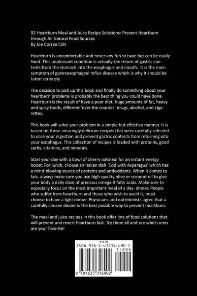 92 Heartburn Meal and Juice Recipe Solutions: Prevent Heartburn through All Natural Food Sources By Joe Correa CSN Heartburn is uncomfortable and never any fun to have but can be easily fixed. This unpleasant condition is actually the return of gastric contents from the stomach into the esophagus and mouth. It is the main symptom of gastroesophageal reflux disease which is why it should be taken seriously. The decision to pick up this book and finally do something about your heartburn problems is probably the best thing you could have done. Heartburn is the result of have a poor diet, huge amounts of fat, heavy and spicy foods, different ‘over the counter’ drugs, alcohol, and cigarettes. This book will solve your problem in a simple but effective manner. It is based on these amazingly delicious recipes that were carefully selected to ease your digestion and prevent gastric contents from returning into your esophagus. This collection of recipes is loaded with proteins, good carbs, vitamins, and minerals. Start your day with a bowl of cherry oatmeal for an instant energy boost. For lunch, choose an Italian dish ‘Cod with Asparagus’ which has a mind-blowing source of proteins and antioxidants. When it comes to fats, always make sure you use high-quality olive or coconut oil to give your body a daily dose of precious omega-3 fatty acids. Make sure to especially focus on the most important meal of a day: dinner. People who suffer from heartburn and those who wish to avoid it, must choose to have a light dinner. Physicians and nutritionists agree that a carefully chosen dinner is the best possible way to prevent heartburn. The meal and juice recipes in this book offer lots of food solutions that will prevent and revert heartburn fast. Try them all and see which ones are your favorite!
