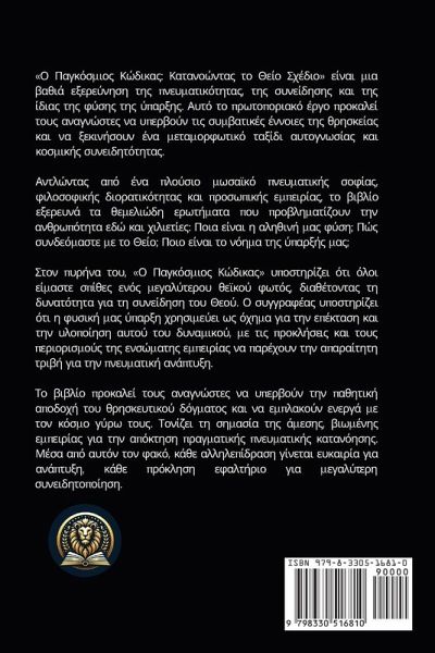 Ο Παγκόσμιος Κώδικας Κατανοώντας το Θείο Σχέδιο είναι μια βαθιά εξερεύνηση της πνευματικότητας, της συνείδησης και της ίδιας της φύσης της ύπαρξης. Αυτό το πρωτοποριακό έργο προκαλεί τους αναγνώστες να υπερβούν τις συμβατικές έννοιες της θρησκείας και να ξεκινήσουν ένα μεταμορφωτικό ταξίδι αυτογνωσίας και κοσμικής συνειδητότητας. Αντλώντας από ένα πλούσιο μωσαϊκό πνευματικής σοφίας, φιλοσοφικής διορατικότητας και προσωπικής εμπειρίας, το βιβλίο εξερευνά τα θεμελιώδη ερωτήματα που προβληματίζουν την ανθρωπότητα εδώ και χιλιετίες Ποια είναι η αληθινή μας φύση; Πώς συνδεόμαστε με το Θείο; Ποιο είναι το νόημα της ύπαρξής μας; Στον πυρήνα του, Ο Παγκόσμιος Κώδικας υποστηρίζει ότι όλοι είμαστε σπίθες ενός μεγαλύτερου θεϊκού φωτός, διαθέτοντας τη δυνατότητα για τη συνείδηση του Θεού. Ο συγγραφέας υποστηρίζει ότι η φυσική μας ύπαρξη χρησιμεύει ως όχημα για την επέκταση και την υλοποίηση αυτού του δυναμικού, με τις προκλήσεις και τους περιορισμούς της ενσώματης εμπειρίας να παρέχουν την απαραίτητη τριβή για την πνευματική ανάπτυξη. Το βιβλίο προκαλεί τους αναγνώστες να υπερβούν την παθητική αποδοχή του θρησκευτικού δόγματος και να εμπλακούν ενεργά με τον κόσμο γύρω τους. Τονίζει τη σημασία της άμεσης, βιωμένης εμπειρίας για την απόκτηση πραγματικής πνευματικής κατανόησης. Μέσα από αυτόν τον φακό, κάθε αλληλεπίδραση γίνεται ευκαιρία για ανάπτυξη, κάθε πρόκληση εφαλτήριο για μεγαλύτερη συνειδητοποίηση. Η έννοια του κάρμα και η ικανότητά μας να το επηρεάζουμε είναι θεμελιώδης για τη φιλοσοφία του βιβλίου. Ο συγγραφέας παρουσιάζει ένα μεταμορφωτικό μονοπάτι που περνάει από το να είμαστε υποκείμενοι στις καρμικές επιδράσεις στο να ασκούμε εξουσία πάνω στο κάρμα, ένα ταξίδι πνευματικής εξέλιξης και αυτοκυριαρχίας. Αυτή η διαδικασία περιλαμβάνει τον καθαρισμό του καρμικού μας μητρώου, όχι τη διαγραφή του παρελθόντος, αλλά την αποδοχή των εμπειριών μας με ανοιχτή καρδιά και νου.