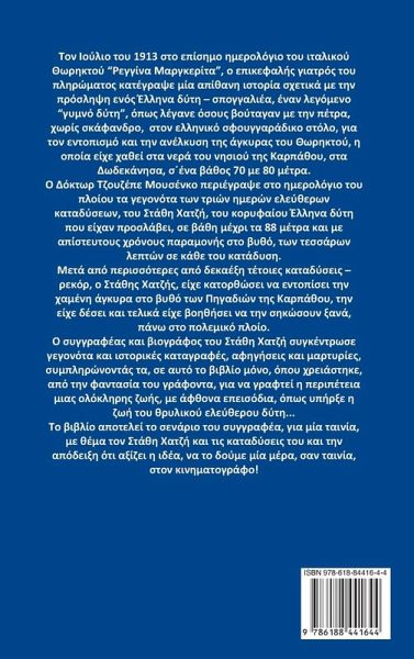 Το 1913 στο επίσημο ημερολόγιο του ιταλικού Θωρηκτού "Ρεγγίνα Μαργκερίτα", ο επικεφαλής γιατρός του πληρώματος κατέγραψε μία απίθανη ιστορία σχετικά με την πρόσληψη ενός Έλληνα δύτη - σπογγαλιέα, έναν λεγόμενο "γυμνό δύτη", κορυφαίο βαθίτη σπογγαλιευτή του ελληνικού σφουγγαράδικου στόλου, για τον εντοπισμό και την ανέλκυση της άγκυρας του θωρηκτού, η οποία είχε χαθεί στα νερά του νησιού της Καρπάθου, στα Δωδεκάνησα, σ΄ένα βάθος 70 με 80 μέτρα.Ο Δόκτωρ Τζουζέπε Μουσένκο περιέγραψε στο ημερολόγιο του πλοίου τα γεγονότα των τριών ημερών ελεύθερων καταδύσεων του Στάθη Χατζή, του κορυφαίου Έλληνα δύτη που είχαν προσλάβει, σε βάθη μέχρι τα 88 μέτρα και με απίστευτους χρόνους παραμονής στο βυθό των τεσσάρων λεπτών σε κάθε του κατάδυση. Μετά από περισσότερες από δεκαέξη τέτοιες καταδύσεις - ρεκόρ, ο Στάθης Χατζής είχε κατορθώσει να εντοπίσει την χαμένη άγκυρα στο βυθό των Πηγαδιών της Καρπάθου, την είχε δέσει και τελικά είχε βοηθήσει να την σηκώσουν ξανά, πάνω στο πολεμικό πλοίο.Ο συγγραφέας και βιογράφος του Στάθη Χατζή συγκέντρωσε γεγονότα και ιστορικές καταγραφές, αφηγήσεις και μαρτυρίες, συμπληρώνοντάς τα σε αυτό το βιβλίο μόνο, όπου χρειάστηκε, από την φαντασία του γράφοντα, για να γραφτεί η περιπέτεια μιας ολόκληρης ζωής, με άφθονα επεισόδια, όπως υπήρξε η ζωή του κορυφαίου ελεύθερου δύτη...Το βιβλίο αποτελεί το σενάριο του συγγραφέα, για μία ταινία, με θέμα τον Στάθη Χατζή και τις θρυλικές περιπέτειες και καταδύσεις του και την απόδειξη ότι αξίζει η ιδέα του, να το δούμε μία μέρα, σαν ταινία, στον κινηματογράφο!