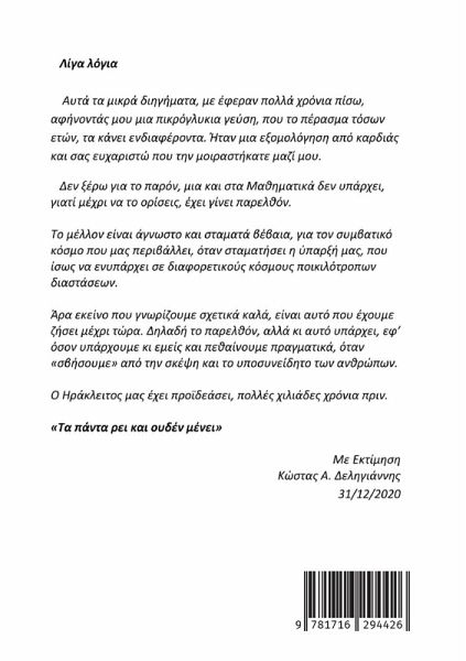 Λίγα λόγια Αυτά τα μικρά διηγήματα, με έφεραν πολλά χρόνια πίσω, αφήνοντάς μου μια πικρόγλυκια γεύση, που το πέρασμα τόσων ετών, τα κάνει ενδιαφέροντα. Ήταν μια εξομολόγηση από καρδιάς και σας ευχαριστώ που την μοιραστήκατε μαζί μου. Δεν ξέρω για το παρόν, μια και στα Μαθηματικά δεν υπάρχει, γιατί μέχρι να το ορίσεις, έχει γίνει παρελθόν. Το μέλλον είναι άγνωστο και σταματά βέβαια, για τον συμβατικό κόσμο που μας περιβάλλει, όταν σταματήσει η ύπαρξή μας, που ίσως να ενυπάρχει σε διαφορετικούς κόσμους ποικιλότροπων διαστάσεων. Άρα εκείνο που γνωρίζουμε σχετικά καλά, είναι αυτό που έχουμε ζήσει μέχρι τώρα. Δηλαδή το παρελθόν, αλλά κι αυτό υπάρχει, εφ' όσον υπάρχουμε κι εμείς και πεθαίνουμε πραγματικά, όταν σβήσουμε από την σκέψη και το υποσυνείδητο των ανθρώπων. Ο Ηράκλειτος μας έχει προϊδεάσει, πολλές χιλιάδες χρόνια πριν. Τα πάντα ρει και ουδέν μένει Με Εκτίμηση Κώστας Α. Δεληγιάννης 31/12/2020