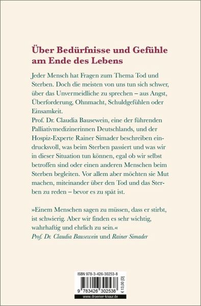 Deutschlands führende Palliativmedizinerin Prof. Dr. Claudia Bausewein und der Hospiz-Experte und Physiotherapeut Rainer Simader kennen viele solcher Geschichten aus ihrem Berufsalltag und wissen um die Ängste, Bedürfnisse und Hoffnungen von sterbenden Menschen und ihren Angehörigen. Deshalb geben sie sehr klare Antworten auf sehr konkrete Fragen zu diesem sensiblen Thema - und machen so Mut, sich mit dem Thema Tod und Sterben zu beschäftigen und darüber nachzudenken und zu reden, bevor es zu spät ist.