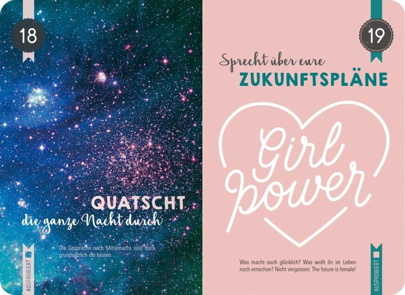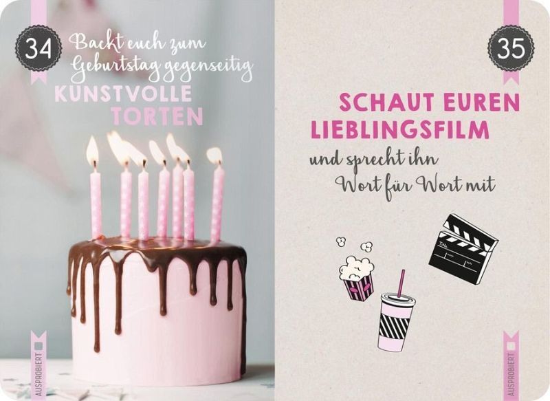 Tolle Ideen für eine gute Zeit mit der besten Freundin Bestellt beim Lieferservice einmal die Karte rauf und runter, schreibt euch gegenseitig eine Kurzbiografie oder startet zusammen einen Blog - dieses Buch steckt voller herrlich verrückter Dinge, mit denen ihr als beste Freundinnen unvergessliche Erinnerungen sammeln werdet. Kästchen zum Abhaken und Platz für eigene kleine Anekdoten zum Eintragen verwandeln dieses Buch in eine wunderschöne Erinnerung an alle großen und kleinen Abenteuer, die ihr gemeinsam bestanden habt. Ein tolles Geschenk für alle besten Freundinnen und alle, die es noch werden könnten.