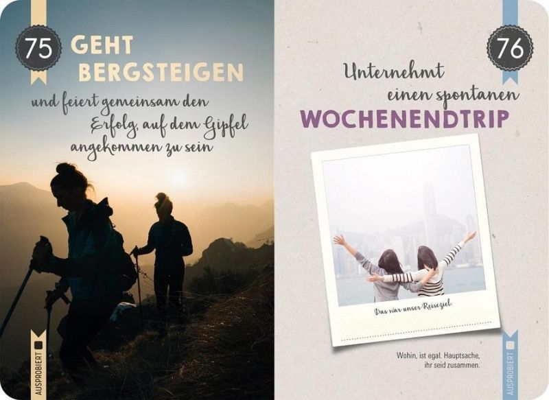 Für unvergessliche Erinnerungen: Wundervolle Anregungen für ein bisschen weniger Alltag und ein bisschen mehr AbenteuerMalt euch euer Leben bunt: 96 Seiten voller unterhaltsamer Kurztexte und passender Fotos in moderner GestaltungMitmachbuch: Kästchen zum Abhaken und Platz für eigene ErinnerungenPraktisches Format: Passt leicht in jede Tasche und ist so immerdabei, mit Lesebändchen und SoftcoverOriginelles Geschenk: Ob für die beste Freundin, für die Lieblingskollegin oder einfach so - mit diesem Buch schenkt man Freude