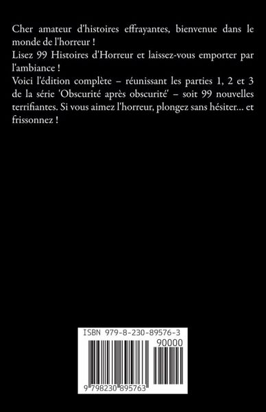 Cher amateur d'histoires effrayantes, bienvenue dans le monde de l'horreur ! Lisez 99 Histoires d'Horreur et laissez-vous emporter par l'ambiance ! Voici l'édition complète - réunissant les parties 1, 2 et 3 de la série 'Obscurité après obscurité' - soit 99 nouvelles terrifiantes. Si vous aimez l'horreur, plongez sans hésiter... et frissonnez !