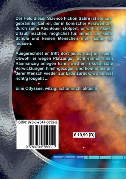 Der Held dieser Science Fiction Satire ist ein aus gebrannter Lehrer, der in komischer Verzweiflung durch seine Abenteuer stolpert. Er will in Alaska Urlaub machen, möglichst für immer, um keine Schule und keinen Menschen mehr sehen zu müssen.Ausgerechnet er trifft dort jedoch auf ein Alien. Obwohl er wegen Platzangst nicht einmal einen Raumanzug anlegen kann, wird er in kosmische Verwicklungen hineingezogen und kommt als anderer Mensch wieder zur Erde zurück, wo es erst richtig losgeht ...Eine Odyssee, witzig, actionreich, aktuell!
