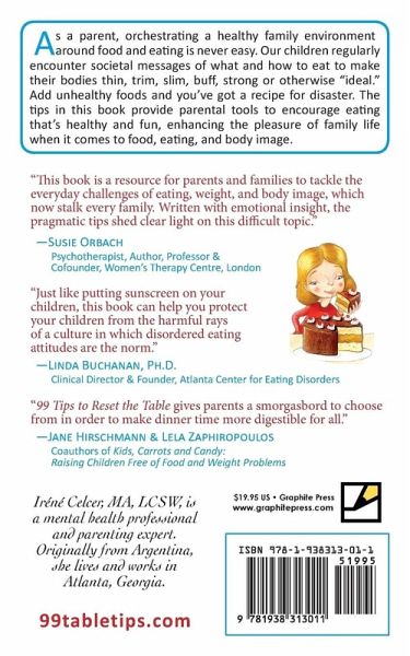 As a parent, orchestrating a healthy family environment around food and eating is never easy. Our children regularly encounter societal messages of what and how to eat to make their bodies thin, trim, slim, buff, strong or otherwise "ideal." Add unhealthy foods and you've got a recipe for disaster. The tips in this book provide parental tools to encourage eating that's healthy and fun, enhancing the pleasure of family life when it comes to food, eating, and body image. Everyone is bombarded with pressures to eat (or not eat) in ways that have nothing to do with simple hunger. And as parents we sometimes feel trapped in an impossible bind: Kids need to eat, but how do we go about feeding them nutritious food in a healthy manner without moving to an all-organic farm? News reports on the perils of obesity in children, coupled with worries about eating disorders and uncertainties about how to avoid body image problems and low self-esteem, seem inescapable. Such issues are uncovered daily in the celebrities our daughters and sons admire as they follow stories on television, in the movies, and in social media. We are coerced by social and cultural forces to adjust our eating in a manner that's inconsistent with our own biology. Instead of eating because it's instinctive--according to a built-in desire designed by nature--we eat to achieve goals that have nothing to do with eating at all. This book is about bringing a voice of balance, trust and joy to your entire life--not just the kitchen or dinning room. You'll learn how to develop a family lifestyle that promotes healthy and nutritious eating, encourages a positive body image, and supports parental responses that are beneficial to the psychological well-being of your children. Like the injections the pediatrician gave your children when they were babies, these tips will help inoculate your children against future challenges with eating, food and body image.