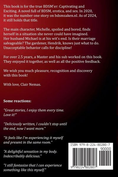 This book is for the true BDSM'er: Captivating and Exciting. A novel full of BDSM, erotica, and sex. In 2020, it was the number one story on bdsmzaken.nl. As of 2024, it still holds that title. The main character, Michelle, spoiled and bored, finds herself in a situation she never could have imagined. Her husband Michael is at his wit's end. Can their marriage be saved? The gardener, Hendrik, knows just what to do. Unacceptable behavior calls for discipline! For over 2.5 years, a Master and his sub worked on this book. Translating this book into English took us also a long time to bring even more joy to people. We are proud that it's finally here. We have enjoyed this journey together. We hope this book brings you much pleasure, recognition, and discovery! With love, Clair Nemas Some reactions: "Great stories, I enjoy them every time. Love it!" "Deliciously written, I couldn't stop until the end, now I want more." "It feels like I'm experiencing it myself and present in the same room." "A delightful sensation in my body. Indescribably delicious." "I still fantasize that I can experience something like this myself."