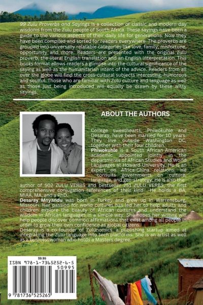 99 Zulu Proverbs and Sayings is a collection of classic and modern-day wisdoms from the Zulu people of South Africa. These sayings have been a guide to the various aspects of their daily life for generations. Now they have been compiled and sorted for readers everywhere. The proverbs are grouped into universally relatable categories like love, family, misfortune, opportunity and more. Readers are presented with the original Zulu proverb, the literal English translation and an English interpretation. This books format allows readers a glimpse into the cultural significance of the saying as well as the humanitarian intent of the advice. Readers from all over the globe will find the cross-cultural subjects interesting, humorous and soulful. Those who are familiar with Zulu culture and language as well as those just being introduced will equally be drawn by these witty sayings.