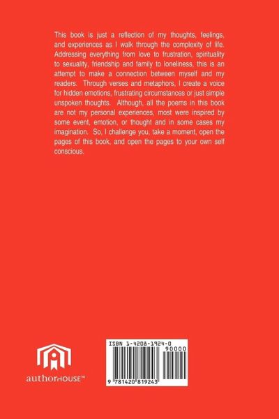 This book is just a reflection of my thoughts, feelings, and experiences as I walk through the complexity of life. Addressing everything from love to frustration, spirituality to sexuality, friendship and family to loneliness, this is an attempt to make a connection between myself and my readers. Through verses and metaphors, I create a voice for hidden emotions, frustrating circumstances or just simple unspoken thoughts. Although, all the poems in this book are not my personal experiences, most were inspired by some event, emotion, or thought and in some cases my imagination. So, I challenge you, take a moment, open the pages of this book, and open the pages to your own self conscious.