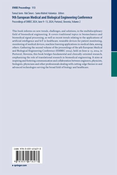 This book informs on new trends, challenges, and solutions, in the multidisciplinary field of biomedical engineering. It covers traditional topics in biomechanics and biomedical signal processing, as well as recent trends relating to the applications of artificial intelligence and IoT in healthcare, wearable devices for patient monitoring, monitoring of medical devices, machine learning applications in medical data, among others. Gathering the second volume of the proceedings of the 9th European Medical and Biological Engineering Conference (EMBEC 2024), held on June 9-13, 2024, in Portoroz, Slovenia, this book bridges fundamental and clinically-oriented research, emphasizing the role of translational research in biomedical engineering. It aims at inspiring and fostering communication and collaboration between engineers, physicists, biologists, physicians and other professionals dealing with cutting-edge themes in and advanced technologies serving the broad field of biology and healthcare.