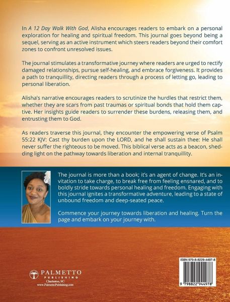 Embark on a Healing Journey: Mending Relationships, Embracing Forgiveness and Finding Peace. Break free from past traumas and spiritual shackles. Turn burdens over to the divine and experience freedom. In this interactive conversational follow-up journal to Alisha's Testimony, Alisha invites readers to dive deep within themselves, seeking personal healing and spiritual liberation. The journal is not just an extension of the first book, but a practical tool designed to guide readers out of their comfort zones, challenging them to address the unresolved issues that might be holding them back. This journal propels you on a transformative journey, where you will be asked to confront and mend broken relationships, seek healing from within, and find the courage to forgive. It offers a roadmap to peace, guiding you through a process of release and into the realm of personal emancipation. Alisha's writing prompts you to examine the chains that bind you, whether they are the remnants of past traumas or the spiritual fetters that keep you in captivity. With her insights and guidance, you will learn to relinquish these burdens, letting them go and turning them over to God. As you navigate through this journal, you will encounter the liberating truth of Psalm 55:22 KJV: Cast thy burden upon the LORD, and he shall sustain thee: He shall never suffer the righteous to be moved. This scripture serves as a guiding light, illuminating the path towards freedom and inner peace. This journal is more than just a book; it is a catalyst for change. It is an invitation to take control of your situation, to no longer feel trapped, but to stride confidently towards personal healing and liberation. Engaging with this journal will spark a transformative journey, one that will lead you to a place of unshackled freedom and profound peace. Take a step towards liberation and healing. Turn the page, and begin your journey with A 12 Day Walk With God.