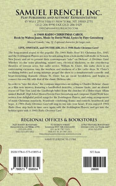 It's Christmas Eve, 1943, and the Feddington Players are now broadcasting from a hole-in-the-wall studio in Newark, New Jersey, and set to present their contemporary "take" on Dickens' A Christmas Carol. Whether it's the noisy plumbing, missed cues, electrical blackouts, or the over-the-top theatrics of veteran actor, but radio novice, William St. Claire, this radio show is an entertaining excursion into the mayhem and madness of a live radio show. St. Claire's escalating foibles and acting missteps propel the show to a simultaneously comedic and heart-wrenching dramatic climax: St. Claire has an on-air breakdown, and begins to connect his own life with that of the classic Dickens tale. In order to "save the show," the company improvises an ending to Charles Dickens' classic as a film noir mystery, featuring a hardboiled detective, a femme fatale, and an absurd rescue of Tiny Tim (and the Lindbergh baby) from the clutches of a Hitler-esque villain named Rudolf!