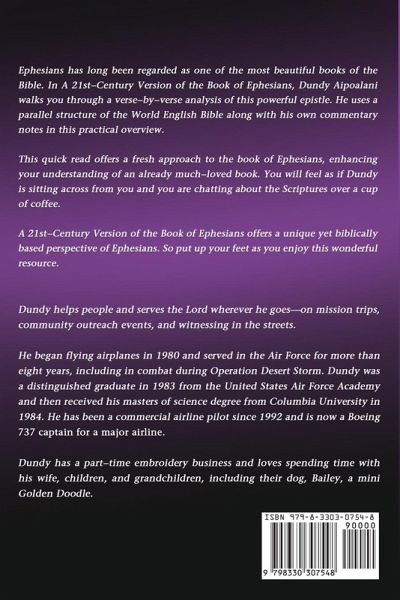 Ephesians has long been regarded as one of the most beautiful books of the Bible. In A 21st-Century Version of the Book of Ephesians, Dundy Aipoalani walks you through a verse-by-verse analysis of this powerful epistle. He uses a parallel structure of the World English Bible along with his own commentary notes in this practical overview.This quick read offers a fresh approach to the book of Ephesians, enhancing your understanding of an already much-loved book. You will feel as if Dundy is sitting across from you and you are chatting about the Scriptures over a cup of coffee.A 21st-Century Version of the Book of Ephesians offers a unique yet biblically based perspective of Ephesians. So put up your feet as you enjoy this wonderful resource.