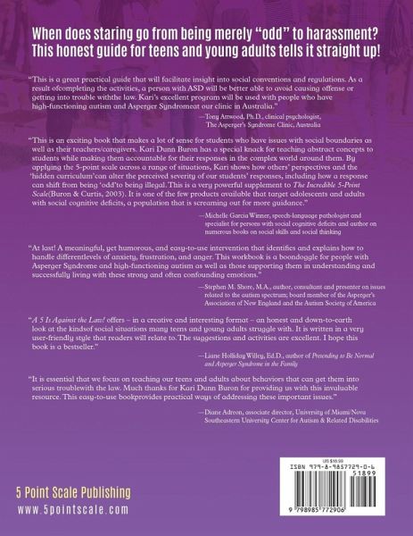 The newly revised version of the Autism Society of America Award Winner (2008) The A 5 is Against the Law! workbook was created especially for adolescents and young adults who have difficulty with social boundaries. The book offers an honest and compassionate look at the kinds of social situations many teens and young adults struggle with. The author uses a concrete, direct and simple approach, incorporating highly systemized scales and stories, to define and visually illustrate what is meant by social boundaries. The book is written in a very user-friendly style with excellent suggestions and activities that can be done in a 1:1 format or a small group, and with the support of a parent, teacher or therapist.