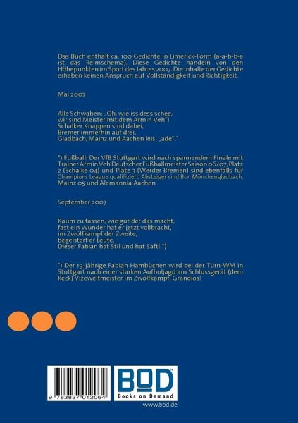 Dieses Buch enthält ca. 100 Gedichte in Limerick-Form (Reimschema a-a-b-b-a). Diese Gedichte handeln von den Höhepunkten in der Welt des Sports des Jahres 2007 und werden durch Fakten in Prosa-Form ergänzt. Beispiel: Kaum zu fassen, wie gut der das macht, fast ein Wunder hat er jetzt vollbracht, im Zwölfkampf der Zweite, begeisterte Leute. Dieser Fabian hat Stil und hat Saft! *) *) Der 19-jährige Fabian Hambüchen wird bei der Turn-WM in Stuttgart nach einer starken Aufholjagd am Schlussgerät Reck noch Vizeweltmeister im Zwölfkampf. Grandios!