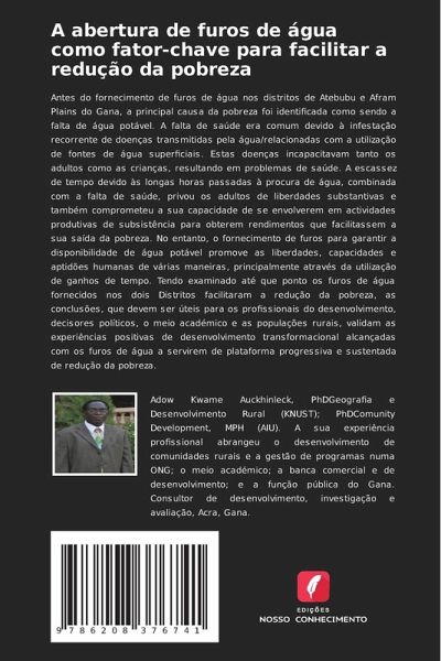 Antes do fornecimento de furos de água nos distritos de Atebubu e Afram Plains do Gana, a principal causa da pobreza foi identificada como sendo a falta de água potável. A falta de saúde era comum devido à infestação recorrente de doenças transmitidas pela água/relacionadas com a utilização de fontes de água superficiais. Estas doenças incapacitavam tanto os adultos como as crianças, resultando em problemas de saúde. A escassez de tempo devido às longas horas passadas à procura de água, combinada com a falta de saúde, privou os adultos de liberdades substantivas e também comprometeu a sua capacidade de se envolverem em actividades produtivas de subsistência para obterem rendimentos que facilitassem a sua saída da pobreza. No entanto, o fornecimento de furos para garantir a disponibilidade de água potável promove as liberdades, capacidades e aptidões humanas de várias maneiras, principalmente através da utilização de ganhos de tempo. Tendo examinado até que ponto os furos de água fornecidos nos dois Distritos facilitaram a redução da pobreza, as conclusões, que devem ser úteis para os profissionais do desenvolvimento, decisores políticos, o meio académico e as populações rurais, validam as experiências positivas de desenvolvimento transformacional alcançadas com os furos de água a servirem de plataforma progressiva e sustentada de redução da pobreza.