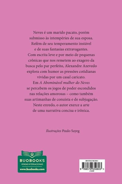 Neves é um marido pacato, porém submisso às intempéries de sua esposa. Refém de seu temperamento instável e de suas fantasias extravagantes. Com escrita leve e por meio de pequenas crônicas que nos remetem ao exagero da busca pelo par perfeito, Alexandre Azevedo explora com humor as pressões cotidianas vividas por um casal caricato. Em A Abominável mulher do Neves se percebem os jogos de poder escondidos nas relações amorosas ¿ como também suas artimanhas de conquista e de subjugação. Neste enredo, o autor exerce a arte de uma narrativa concisa e irônica.