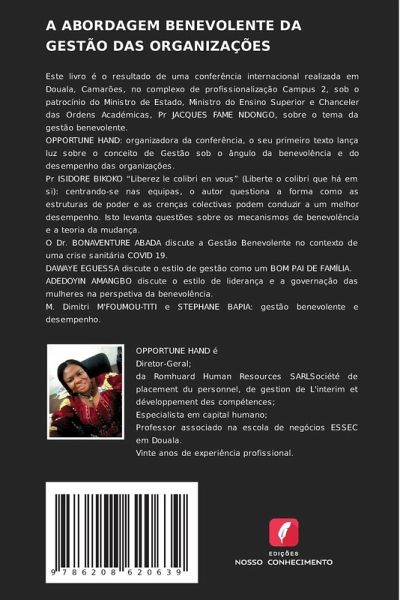 Este livro é o resultado de uma conferência internacional realizada em Douala, Camarões, no complexo de profissionalização Campus 2, sob o patrocínio do Ministro de Estado, Ministro do Ensino Superior e Chanceler das Ordens Académicas, Pr JACQUES FAME NDONGO, sobre o tema da gestão benevolente.OPPORTUNE HAND: organizadora da conferência, o seu primeiro texto lança luz sobre o conceito de Gestão sob o ângulo da benevolência e do desempenho das organizações.Pr ISIDORE BIKOKO "Liberez le colibri en vous" (Liberte o colibri que há em si): centrando-se nas equipas, o autor questiona a forma como as estruturas de poder e as crenças colectivas podem conduzir a um melhor desempenho. Isto levanta questões sobre os mecanismos de benevolência e a teoria da mudança.O Dr. BONAVENTURE ABADA discute a Gestão Benevolente no contexto de uma crise sanitária COVID 19.DAWAYE EGUESSA discute o estilo de gestão como um BOM PAI DE FAMÍLIA. ADEDOYIN AMANGBO discute o estilo de liderança e a governação das mulheres na perspetiva da benevolência.M. Dimitri M'FOUMOU-TITI e STEPHANE BAPIA: gestão benevolente e desempenho.