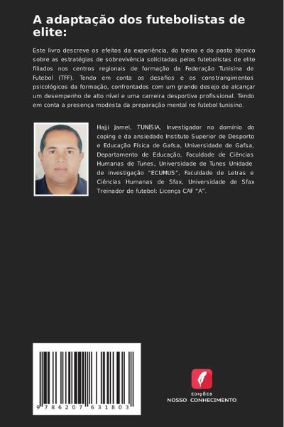 Este livro descreve os efeitos da experiência, do treino e do posto técnico sobre as estratégias de sobrevivência solicitadas pelos futebolistas de elite filiados nos centros regionais de formação da Federação Tunisina de Futebol (TFF). Tendo em conta os desafios e os constrangimentos psicológicos da formação, confrontados com um grande desejo de alcançar um desempenho de alto nível e uma carreira desportiva profissional. Tendo em conta a presença modesta da preparação mental no futebol tunisino.