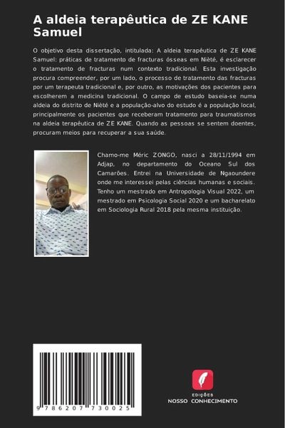 O objetivo desta dissertação, intitulada: A aldeia terapêutica de ZE KANE Samuel: práticas de tratamento de fracturas ósseas em Nièté, é esclarecer o tratamento de fracturas num contexto tradicional. Esta investigação procura compreender, por um lado, o processo de tratamento das fracturas por um terapeuta tradicional e, por outro, as motivações dos pacientes para escolherem a medicina tradicional. O campo de estudo baseia-se numa aldeia do distrito de Nièté e a população-alvo do estudo é a população local, principalmente os pacientes que receberam tratamento para traumatismos na aldeia terapêutica de ZE KANE. Quando as pessoas se sentem doentes, procuram meios para recuperar a sua saúde.
