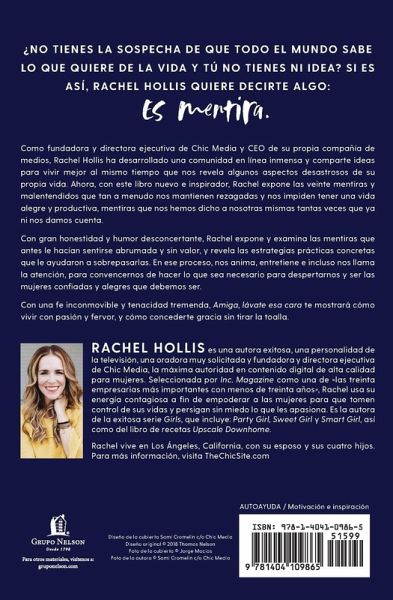 BEST SELLER #1 DEL NEW YORK TIMES EN INGLÉS ¿Has pensado alguna vez que todos los demás tienen la vida resuelta y tu no tienes idea? Si es así, Rachel Hollis tiene algo que decirte: eso es mentira. Con un ingenio irónico y una sabiduría lograda con esfuerzo, la popular celebridad en línea y fundadora de TheChicSite.com, Rachel Hollis, ayuda a sus lectoras a liberarse de las mentiras que las mantienen alejadas de la vida exuberante y rebosante de alegría que deberían tener. Fundadora del sitio web sobre estilos de vida TheChicSite.com y directora ejecutiva de su propia compañía de medios, Chic Media, Rachel Hollis ha creado una base de fans en línea de cientos de miles de fanáticas al impartir consejos para una vida mejor, mientras revela intrépidamente su propio desorden. Ahora llega su tan esperado primer libro en español, presentando la típica combinación de honestidad, humor y consejos prácticos y directos. Cada capítulo comienza con una mentira específica que ella una vez creyó y la hizo sentir abrumada, indigna o lista para darse por vencida. Siendo una madre trabajadora, exmadre adoptiva y una mujer que ha lidiado con todo tipo de inseguridades acerca de su cuerpo y sus relaciones, Hollis habla con la comprensión y el afecto de una mejor amiga, ayudando a las mujeres a deshacerse de la mentalidad limitante que destruye la confianza en sí mismas e impiden el avance. Desde una obsesión pasajera por casarse con Matt Damon, hasta una ensoñación que involucra iguanas hipnóticas, a la petición de su hijo de que se comprara un collar para "ser como las otras mamás", Hollis no oculta nada. Con fe y tenacidad inquebrantables, estimula a otras mujeres a vivir con pasión y prisa, y a despertar sus sueños dormidos. Conoce más en rachelhollislibros.com Girl, Wash Your Face Do you ever suspect that everyone else has life figured out and you don't have a clue? If so, Rachel Hollis has something to tell you: that's a lie. As the founder of the lifestyle website TheChicSite.com and CEO of her own media company, Rachel Hollis developed an immense online community by sharing tips for better living while fearlessly revealing the messiness of her own life. Now, in this challenging and inspiring new book, Rachel exposes the twenty lies and misconceptions that too often hold us back from living joyfully and productively, lies we've told ourselves so often we don't even hear them anymore. With painful honesty and fearless humor, Rachel unpacks and examines the falsehoods that once left her feeling overwhelmed and unworthy, and reveals the specific practical strategies that helped her move past them. In the process, she encourages, entertains, and even kicks a little butt, all to convince you to do whatever it takes to get real and become the joyous, confident woman you were meant to be. With unflinching faith and rock-hard tenacity, Girl, Wash Your Face shows you how to live with passion and hustle--and how to give yourself grace without giving up.