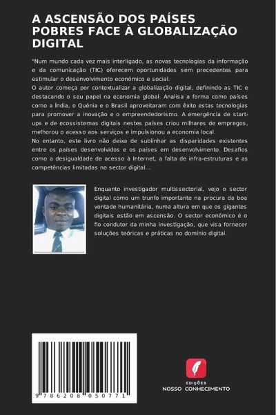 "Num mundo cada vez mais interligado, as novas tecnologias da informação e da comunicação (TIC) oferecem oportunidades sem precedentes para estimular o desenvolvimento económico e social.O autor começa por contextualizar a globalização digital, definindo as TIC e destacando o seu papel na economia global. Analisa a forma como países como a Índia, o Quénia e o Brasil aproveitaram com êxito estas tecnologias para promover a inovação e o empreendedorismo. A emergência de start-ups e de ecossistemas digitais nestes países criou milhares de empregos, melhorou o acesso aos serviços e impulsionou a economia local.No entanto, este livro não deixa de sublinhar as disparidades existentes entre os países desenvolvidos e os países em desenvolvimento. Desafios como a desigualdade de acesso à Internet, a falta de infra-estruturas e as competências limitadas no sector digital...