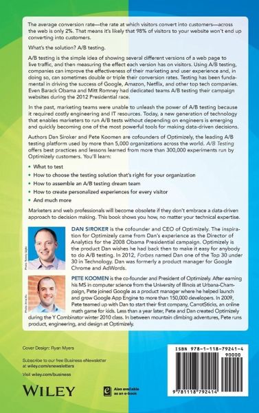 Authors Dan Siroker and Pete Koomen are cofounders of Optimizely, the leading A/B testing platform used by more than 5,000 organizations across the world. A/B Testing: The Most Powerful Way to Turn Clicks Into Customers offers best practices and lessons learned from more than 300,000 experiments run by Optimizely customers. You'll learn: