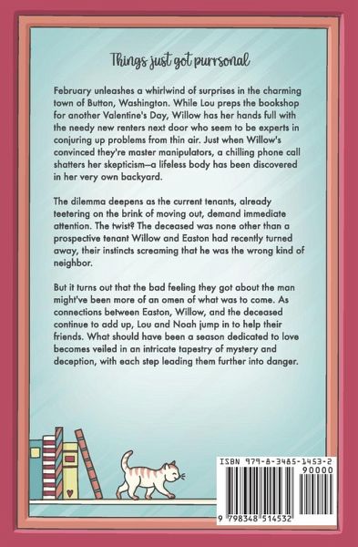 Things just got purrsonal. February unleashes a whirlwind of surprises in the charming town of Button, Washington. While Lou preps the bookshop for another Valentine's Day, Willow has her hands full with the needy new renters next door who seem to be experts in conjuring up problems from thin air. Just when Willow's convinced they're master manipulators, a chilling phone call shatters her skepticism - a lifeless body has been discovered in their very own backyard. The dilemma deepens as the current tenants, already teetering on the brink of moving out, demand immediate attention. The twist? The deceased was none other than a prospective tenant Willow and Easton had recently turned away, their instincts screaming that he was the wrong kind of neighbor. But it turns out that the bad feeling they got about the man might've been more of an omen of what was to come. As connections between Easton, Willow, and the deceased continue to add up, Lou and Noah jump in to help their friends. What should have been a season dedicated to love becomes veiled in an intricate tapestry of mystery and deception, with each step leading them further into danger. Dear reader, if you love rescue cats, goats who wear pajamas, and a cozy bookstore, you're going to love this series by Eryn Scott. Hold on to your hats. The town of Button is as cute as they come, but that doesn't mean it's free of murder. Each book and mystery stands alone. Curl up under a cozy blanket, cuddle with a cat (or two), and come join Lou as she solves mysteries in the town of Button.