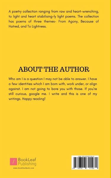 A poetry collection ranging from raw and heart-wrenching, to light and heart stabilising-ly light poems. The collection has poems of three themes- From Agony, Because of Hatred, and To Lightness.
