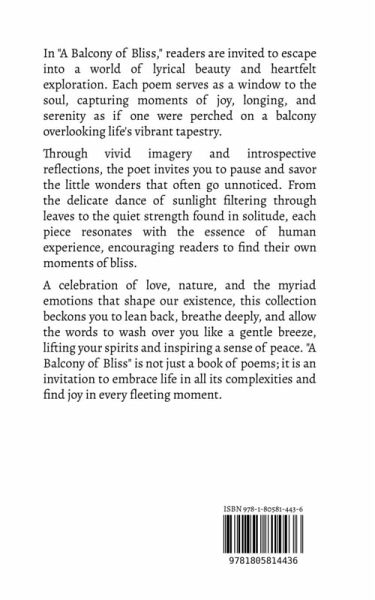 In "A Balcony of Bliss," readers are invited to escape into a world of lyrical beauty and heartfelt exploration. Each poem serves as a window to the soul, capturing moments of joy, longing, and serenity as if one were perched on a balcony overlooking life's vibrant tapestry. Through vivid imagery and introspective reflections, the poet invites you to pause and savor the little wonders that often go unnoticed. From the delicate dance of sunlight filtering through leaves to the quiet strength found in solitude, each piece resonates with the essence of human experience, encouraging readers to find their own moments of bliss. A celebration of love, nature, and the myriad emotions that shape our existence, this collection beckons you to lean back, breathe deeply, and allow the words to wash over you like a gentle breeze, lifting your spirits and inspiring a sense of peace. "A Balcony of Bliss" is not just a book of poems; it is an invitation to embrace life in all its complexities and find joy in every fleeting moment.