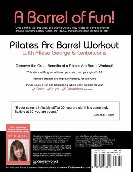 Enjoy the Whole-Body Health Benefits of a Pilates Arc Barrel Workout! A Barrel of Fun! Pilates Arc Barrel Workout Get the health improvement benefits of the Pilates Arc Barrel exercises to increase core strength, improve flexibility and mobility of the spine, help reduce shoulder-pain with better arm and shoulder mechanics, strengthen hips, improve gait for walking and running, and help eliminate lower back pain. This is a great resource for Pilates teachers, students, and fitness professionals who are looking for inspiring ways to incorporate the Pilates Arc Barrel exercises into your workout programs! Train and target the areas of improvement you want to focus on for your workouts. "A Barrel of Fun" book is filled with more than 200 photos, step-by-step exercise instructions, repetition guidelines, recommended breathing patterns, and benefits of every Pilates Arc Barrel exercise to help you maximize your workouts. Discover Easy-to-Learn Pilates Arc Barrel Exercises for: Warm-up and Cool-downs Arm and Shoulder Mechanics Core Stretching and Strengthening Hips and Legs - Strength, Flexibility and Mobility Total Body Conditioning for Whole-Body Health "If your spine is inflexibly stiff at 30, you are old. If it is completely flexible at 60, you are young." - Joseph H. Pilates Bend your mind and spine with your own copy of "A Barrel of Fun!"