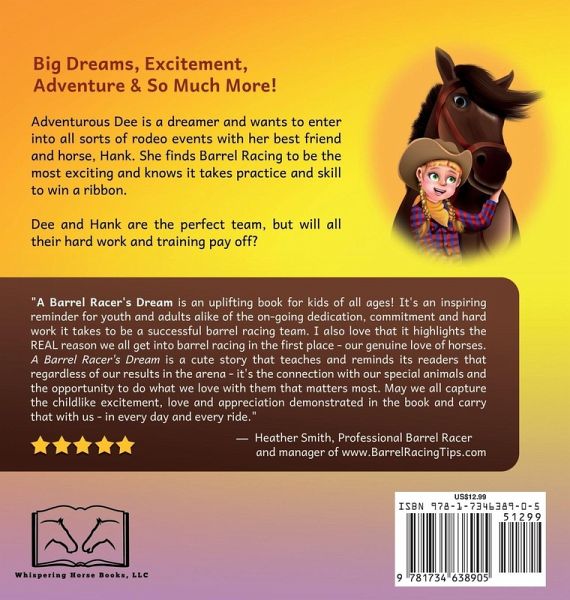 Do you have a dreamer in your family? A child who loves adventure? Horses? Then this is the book for you! Adventurous dreamer Dee loves the rodeo and her favorite event is Barrel Racing. She has been dreaming about her first race with her best friend Hank for as long as she can remember. They have worked hard, practiced and persevered. But will it be enough? Is the blue ribbon within their grasp? A Barrel Racer's Dream is a great way for kids to learn about the power of dreaming, setting goals and taking action to make their dreams come true! Kids will learn:What goes into caring for a horse Friendship / love between horse and rider More about the sport of Barrel Racing Importance of preparation, persistence and practice and good sportsmanship - win or lose Grab your copy and let the adventure begin!