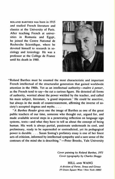 A Barthes Reader gives one the image of Barthes as one of the great public teachers of our time, someone who thought out, argued for, and made available several steps in a penetrating reflection on language sign systems, texts- and what they have to tell us about the concept of being human. Susan Sontag's prefatory essay is one of her finest acts of criticism, informed by intellectual sympathy and a sure sense of the contours of the mind she is describing.