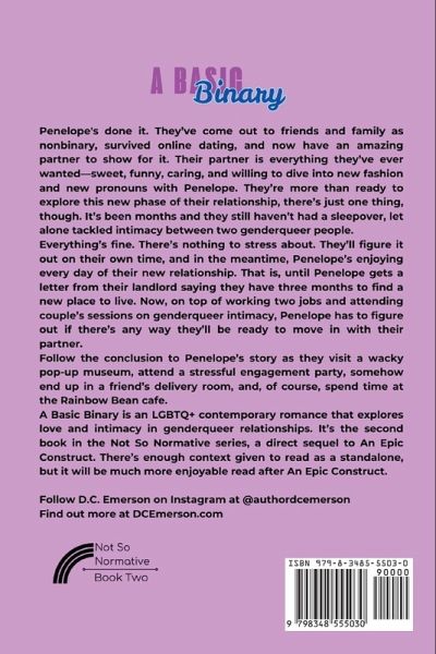 Penelope's done it. They've come out to friends and family as nonbinary, survived online dating, and now have an amazing partner to show for it. Their partner is everything they've ever wanted-sweet, funny, caring, and willing to dive into new fashion and new pronouns with Penelope. They're more than ready to explore this new phase of their relationship, there's just one thing, though. It's been months and they still haven't had a sleepover, let alone tackled intimacy between two genderqueer people. Everything's fine. There's nothing to stress about. They'll figure it out on their own time, and in the meantime, Penelope's enjoying every day of their new relationship. That is, until Penelope gets a letter from their landlord saying they have three months to find a new place to live. Now, on top of working two jobs and attending couple's sessions on genderqueer intimacy, Penelope has to figure out if there's any way they'll be ready to move in with their partner. Follow the conclusion to Penelope's story as they visit a wacky pop-up museum, attend a stressful engagement party, somehow end up in a friend's delivery room, and, of course, spend time at the Rainbow Bean cafe. A Basic Binary is an LGBTQ+ contemporary romance that explores love and intimacy in genderqueer relationships. It's the second book in the Not So Normative series, a direct sequel to An Epic Construct. There's enough context given to read as a standalone, but it will be much more enjoyable read after An Epic Construct.