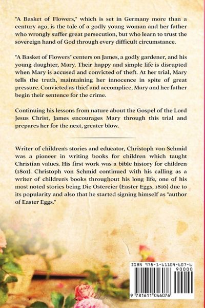 "A Basket of Flowers," which is set in Germany 100 years ago, is the tale of a godly young woman and her father who wrongly suffer great persecution, but who learn to trust the sovereign hand of God through every difficult circumstance. "A Basket of Flowers" centers on James, a godly gardener, and his young daughter, Mary. Their happy and simple life is disrupted when Mary is accused and convicted of theft. At her trial, Mary tells the truth, maintaining her innocence in spite of great pressure. Convicted as thief and accomplice, Mary and her father begin their sentence for the crime. Continuing his lessons from nature about the Gospel of the Lord Jesus Christ, James encourages Mary through this trial and prepares her for the next, greater blow. Writer of children's stories and educator, ¿Christoph von Schmid was a pioneer in writing books for children which taught Christian values. His first work was a bible history for children (1801). Christoph von Schmid continued with his calling as a writer of children's books throughout his long life, one of his most noted stories being Die Ostereier (Easter Eggs, 1816) due to its popularity and also that he started signing himself as "author of Easter Eggs."