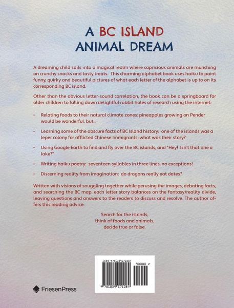 A dreaming child sails into a magical realm where capricious animals are munching on crunchy snacks and tasty treats. This charming alphabet book uses haiku to paint funny, quirky and beautiful pictures of what each letter of the alphabet is up to on its corresponding BC island. Other than the obvious letter-sound correlation, the book can be a springboard for older children to falling down delightful rabbit holes of research using the internet: * relating foods to their natural climate zones: pineapples growing on Pender would be wonderful, but... * learning some of the obscure facts of BC Island history: one of the islands was a leper colony for afflicted Chinese Immigrants; what was their story? * using Google Earth to find and fly over the BC islands, and "Hey! Isn't that one a lake?" * writing haiku poetry: seventeen syllables in three lines, no exceptions! * discerning reality from imagination: do dragons really eat dates? Written with visions of snuggling together while perusing the images, debating facts, and searching the BC map, each letter story balances on the fantasy/reality divide, leaving questions and answers to the readers to discuss and resolve. The author offers this reading advice: Search for the islands, think of foods and animals, decide true or false.