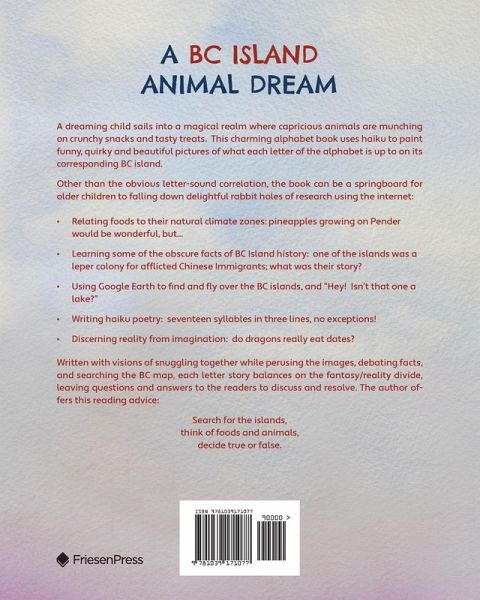 A dreaming child sails into a magical realm where capricious animals are munching on crunchy snacks and tasty treats. This charming alphabet book uses haiku to paint funny, quirky and beautiful pictures of what each letter of the alphabet is up to on its corresponding BC island. Other than the obvious letter-sound correlation, the book can be a springboard for older children to falling down delightful rabbit holes of research using the internet: * relating foods to their natural climate zones: pineapples growing on Pender would be wonderful, but... * learning some of the obscure facts of BC Island history: one of the islands was a leper colony for afflicted Chinese Immigrants; what was their story? * using Google Earth to find and fly over the BC islands, and "Hey! Isn't that one a lake?" * writing haiku poetry: seventeen syllables in three lines, no exceptions! * discerning reality from imagination: do dragons really eat dates? Written with visions of snuggling together while perusing the images, debating facts, and searching the BC map, each letter story balances on the fantasy/reality divide, leaving questions and answers to the readers to discuss and resolve. The author offers this reading advice: Search for the islands, think of foods and animals, decide true or false.