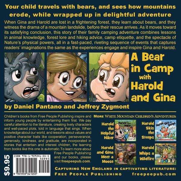 After a campsite encounter with an orphaned bear, Gina and Harold soon confront a larger challenge. A sudden landslide covers the forest trail that would lead them back to camp. Before their parents arrive to rescue them, the children endure a woodland escapade that teaches them about New England black bears. As it moves toward its satisfying conclusion, A Bear in Camp with Harold and Gina combines lessons in animal knowledge, forest lore and hiking advice, camp etiquette, and the spectacle of Nature's physical powers, all in a fast-paced, riveting sequence of events that captures readers' imaginations the same as the experiences engage and inspire Gina and Harold. Colorful, pleasing and playful illustrations work together with crisp narrative to keep children focused on each page as Harold and Gina's exciting and inspiring adventure moves toward its satisfying conclusion. Educational articles in the back of the book provide interesting information about landslides and especially about bears in their natural environment. A Bear in Camp with Harold and Gina is the sixth book in the White Mountain Children's Adventure Series from Free People Publishing. Other books in the series are Harold and Gina Meet a Moose, Harold the Helpful Hiker, Harold Leaps into Lake Winnie, Harold Whips a Wildfire, and Harold Skis the Steeps. All of the books are freestanding and do not need to be read in any sequence. All contain charming, encouraging and action-packed stories that convey accurate knowledge and understanding of Nature to children, while encouraging children to be active and enjoy the outdoors.