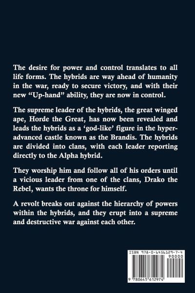 The second book in the Decimation series. The desire for power and control translates to all life forms. The hybrids are way ahead of humanity in the war, ready to secure the victory and with their new "Up-hand" ability, they are now in control. The supreme leader of the hybrids, the great winged ape, Horde the Great has now been revealed and leads the hybrid clans as a 'god-like' figure in the hyper advanced castle known as the Brandis. The hybrids are divided into clans, with each leader reporting directly to the Alpha hybrid. They worship and follow all of his orders until a vicious leader from one of the clans, Drako the Rebel, wants the power for himself. A revolt breaks out against the hierarchy of powers within the hybrids, and they erupt into a supreme and destructive war against each other.