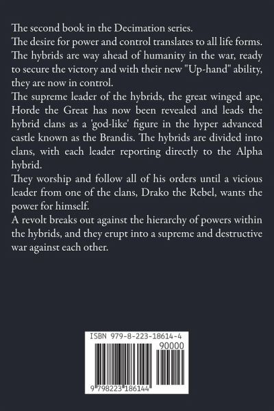 The second book in the Decimation series. The desire for power and control translates to all life forms. The hybrids are way ahead of humanity in the war, ready to secure the victory and with their new "Up-hand" ability, they are now in control. The supreme leader of the hybrids, the great winged ape, Horde the Great has now been revealed and leads the hybrid clans as a 'god-like' figure in the hyper advanced castle known as the Brandis. The hybrids are divided into clans, with each leader reporting directly to the Alpha hybrid. They worship and follow all of his orders until a vicious leader from one of the clans, Drako the Rebel, wants the power for himself. A revolt breaks out against the hierarchy of powers within the hybrids, and they erupt into a supreme and destructive war against each other.