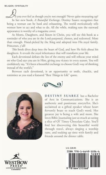 Do you ever feel as though you're not enough? Never quite measuring up? In her new book, A Beautiful Exchange, Destiny Suarez recognizes that being a woman can be hard and exhausting. The world meticulously tells women how to act and what to do. All the while, making sure the outward appearance is worthy of a magazine cover. As Moms, Daughters, and Sisters in Christ, you will see this book as a reminder of who you are in the Lord-purposed, chosen, and redeemed. More than enough. Hand-picked by the King and adopted into His royal family. Princesses, y'all! This book dives deep into the heart of God, and how He feels about his daughters. It reveals the royal inheritance that will transform your life. Each devotional defeats the lies of the enemy and will refocus your mind on who God says you are in Him, giving you victory in every season. You will confidently say, "It's been a beautiful exchange to choose God's way of thinking instead of the world's." Between each devotional, is an opportunity to smile, chuckle, and reminisce as you read a featured "Best Things in Life" quote.