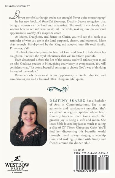 Do you ever feel as though you're not enough? Never quite measuring up? In her new book, A Beautiful Exchange, Destiny Suarez recognizes that being a woman can be hard and exhausting. The world meticulously tells women how to act and what to do. All the while, making sure the outward appearance is worthy of a magazine cover. As Moms, Daughters, and Sisters in Christ, you will see this book as a reminder of who you are in the Lord-purposed, chosen, and redeemed. More than enough. Hand-picked by the King and adopted into His royal family. Princesses, y'all! This book dives deep into the heart of God, and how He feels about his daughters. It reveals the royal inheritance that will transform your life. Each devotional defeats the lies of the enemy and will refocus your mind on who God says you are in Him, giving you victory in every season. You will confidently say, "It's been a beautiful exchange to choose God's way of thinking instead of the world's." Between each devotional, is an opportunity to smile, chuckle, and reminisce as you read a featured "Best Things in Life" quote.