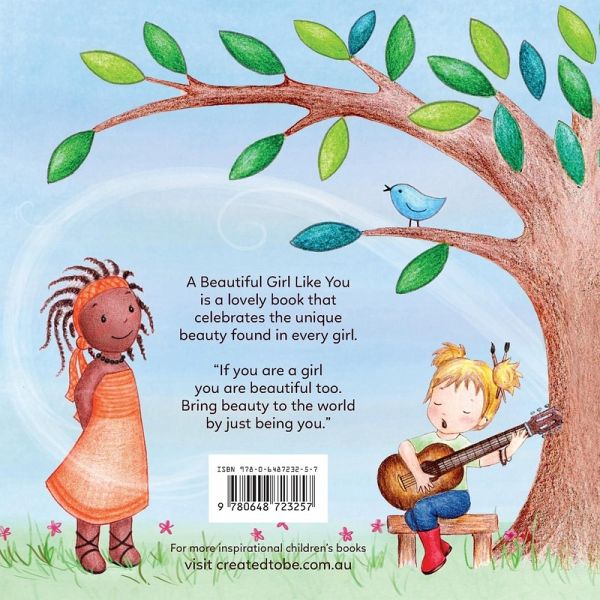 Have a special little girl in your life? Help her self-esteem soar as she discovers some of the wonderful ways she brings beauty to the world. A Beautiful Girl Like You is a heart-warming book that celebrates the unique beauty found in every girl. Whether you have skin like desert sands, gold hair like the sun, a smile that brings hope or a passion for justice, "If you are a girl you are beautiful too. Bring beauty to the world by just being you!" With charming rhyme and sweet illustrations, this special book will inspire little girls and big girls alike to value what makes them unique and the part they can play in making the world a more wonderful place. Find free resources like lesson ideas, videos and colouring sheets at createdtobe.com.au/resources