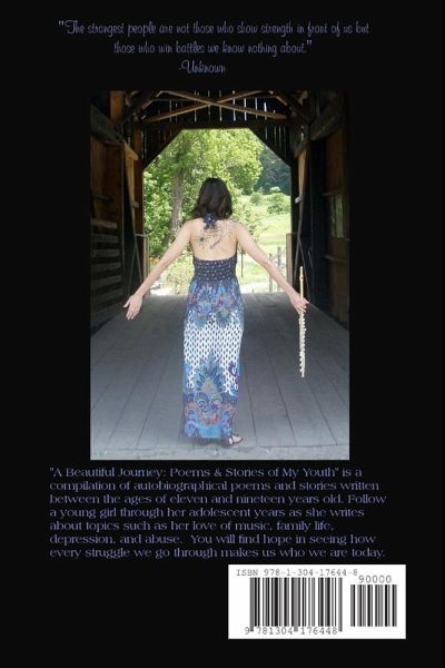 "A Beautiful Journey: Poems & Stories of My Youth" is a compilation of autobiographical writing by Kayla Maclay. She includes poems and stories she wrote between the ages of eleven and nineteen years old. Follow her through her adolescent years as she writes about topics such as her love of music, family life, depression, and abuse. This book is a testimony of her changing life. You will find hope in seeing how every struggle we go through makes us who we are today. The Second Edition features an updated front and back cover.