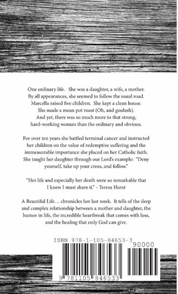 One ordinary life. She was a daughter, a wife, a mother. By all appearances, she seemed to follow the usual road. Marcella raised five children. She kept a clean house. She made a mean pot roast (oh, and goulash). And yet, there was so much more to that strong, hard-working woman than the ordinary and obvious. For over ten years she battled terminal cancer and instructed her children on the value of redemptive suffering and the immeasurable importance she placed on her Catholic faith. She taught her daughter through our Lord's example: "Deny yourself, take up your cross, and follow." "Her life and especially her death were so remarkable that I knew I must share it." Teresa Hurst A Beautiful Life... chronicles her last week. It tells of the deep and complex relationship between a mother and daughter, the humor in life, the incredible heartbreak that comes with loss, and the healing that only God can give.