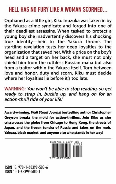 The most dangerous woman in the world is the one who is completely dead inside. For hell has no fury like a woman scorned... Orphaned as a little girl, Kiku Inuzuka was taken in by the Yakuza crime syndicate and forged into one of their deadliest assassins. When tasked to protect a young boy she inadvertently discovers his shocking true identity-heir to the Yakuza throne. The startling revelation tests her deep loyalties to the organization that saved her. With a price on the boy's head and a target on her back, she must not only shield him from the ruthless Russian mafia but also from a traitor within the Yakuza itself. Torn between love and honor, duty and scorn, Kiku must decide where her loyalties lie before it's too late. WARNING: If you have plans, cancel them! You won't be able to stop reading, so get ready to strap in, buckle up, and hang on for an action-thrill ride of your life! Award-winning, Wall Street Journal bestselling author Christopher Greyson breaks the mold for action-thrillers. Join Kiku as she races across the globe from Chicago to Hong Kong, the streets of Japan, and the tundra of Russia, taking on the mob, Yakuza, black market, and anyone else who stands in her way! Grab your copy and start reading this electrifying novel today! Christopher Greyson's novels have been read by millions of readers. Look for other standalone novels by Wall Street Journal bestselling author Christopher Greyson featuring leading man Detective Jack Stratton. These books can be read in any order. The Detective Jack Stratton Mystery-Thriller Series And Then She Was Gone (Prequel) Girl Jacked Jack Knifed Jacks Are Wild Jack and the Giant Killer Data Jack Jack of Hearts Jack Frost Jack of Diamonds Captain Jack Also by Christopher Greyson: The Girl Who Lived One Little Lie The Adventures of Finn & Annie Pure of Heart KIKU - The Yakuza War Trilogy A Beautiful Place to Die Kindle the Fires of War Dance of Death