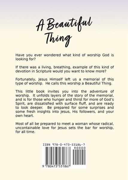 Have you ever wondered what kind of worship God is looking for? If there was a living, breathing example of this kind of devotion in Scripture, would you want to know more? Fortunately, Jesus himself, left us a memorial of this type of worship. He calls this worship a Beautiful Thing. This little book invites you into the adventure of worship. It unfolds layers of the story of the memorial, and is for those who hunger and thirst for more of God's Spirit, are dissatisfied with surface fluff, and are ready to look deeper. Be prepared for some surprises and some fresh insights into Jesus, his followers, and your own heart. Most of all, be prepared to meet a woman whose radical, uncontainable love for Jesus sets the bar for worship, for all time.