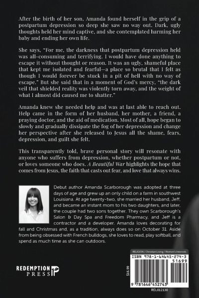 After the birth of her son, Amanda found herself in the grip of a postpartum depression so deep she saw no way out. Dark, ugly thoughts held her mind captive, and she contemplated harming her baby and ending her own life. She says, "For me, the darkness that postpartum depression held was all-consuming and terrifying. I would have done anything to escape it without thought or reason. It was an ugly, shameful place that kept me isolated and fearful-a place so brutal that I felt as though I would forever be stuck in a pit of hell with no way of escape." But she said that in a moment of God's mercy, "the dark veil that shielded reality was violently torn away, and the weight of what I almost did caused me to shatter." Amanda knew she needed help and was at last able to reach out. Help came in the form of her husband, her mother, a friend, a praying doctor, and the aid of medication. Most of all, hope began to slowly and gradually dissipate the fog of her depression and change her perspective after she released to Jesus all the shame, fears, depression, and guilt she felt. This transparently told, brave personal story will resonate with anyone who suffers from depression, whether postpartum or not, or loves someone who does. A Beautiful War highlights the hope that comes from Jesus, the faith that casts out fear, and love that always wins. Inside the book, you'll also have full access to a downloadable Companion Journal to support your personal reflection and healing.