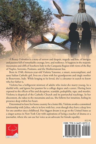 A Beauty Unbroken is a story of sorrow and despair, tragedy and loss, of intrigue and passion full of remarkable courage, love, and resilience. It happens in the majestic mountains and cliffs of Southern Italy in the Campania Region with views of the Bay of Naples, Sorrento, Positano, and the Mediterranean Sea. Born in 1948, thirteen-year-old Violetta Yanonne, a smart, noncompliant, and sassy Italian Catholic girl, lives on a farm with her grandparents and single mother in Benevento, Italy. While longing to be loved, she's a dreamer in search to know who her father is. Violetta has a belligerent mistrust of adults who insist she marry young, be a dutiful wife, and ignore her passion for a college degree and a career. Having been exposed to the effects of lies and deception, scandals, pedophilia, rape, and murder, Violetta is skeptical of the Catholic Church and its patriarchal teachings. In her discontent, she takes to the mountains and sea. She follows her intuition, feeling its presence deep within her heart. Determined to leave her home country for a better life, Violetta avoids a committed relationship with Julius, who is in love with her, even though they have a deep love for one another since childhood. Her biggest dream is to go to the United States as a singer-actress in New York City with aspirations of being a teacher of drama or a journalist, where she can use her voice as an advocate for female equality.